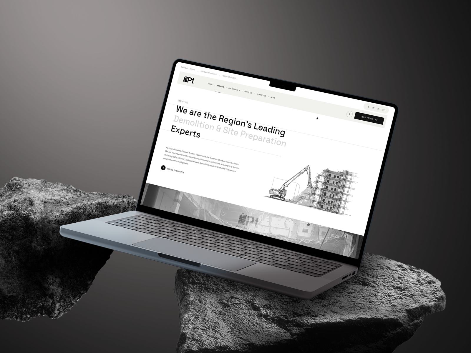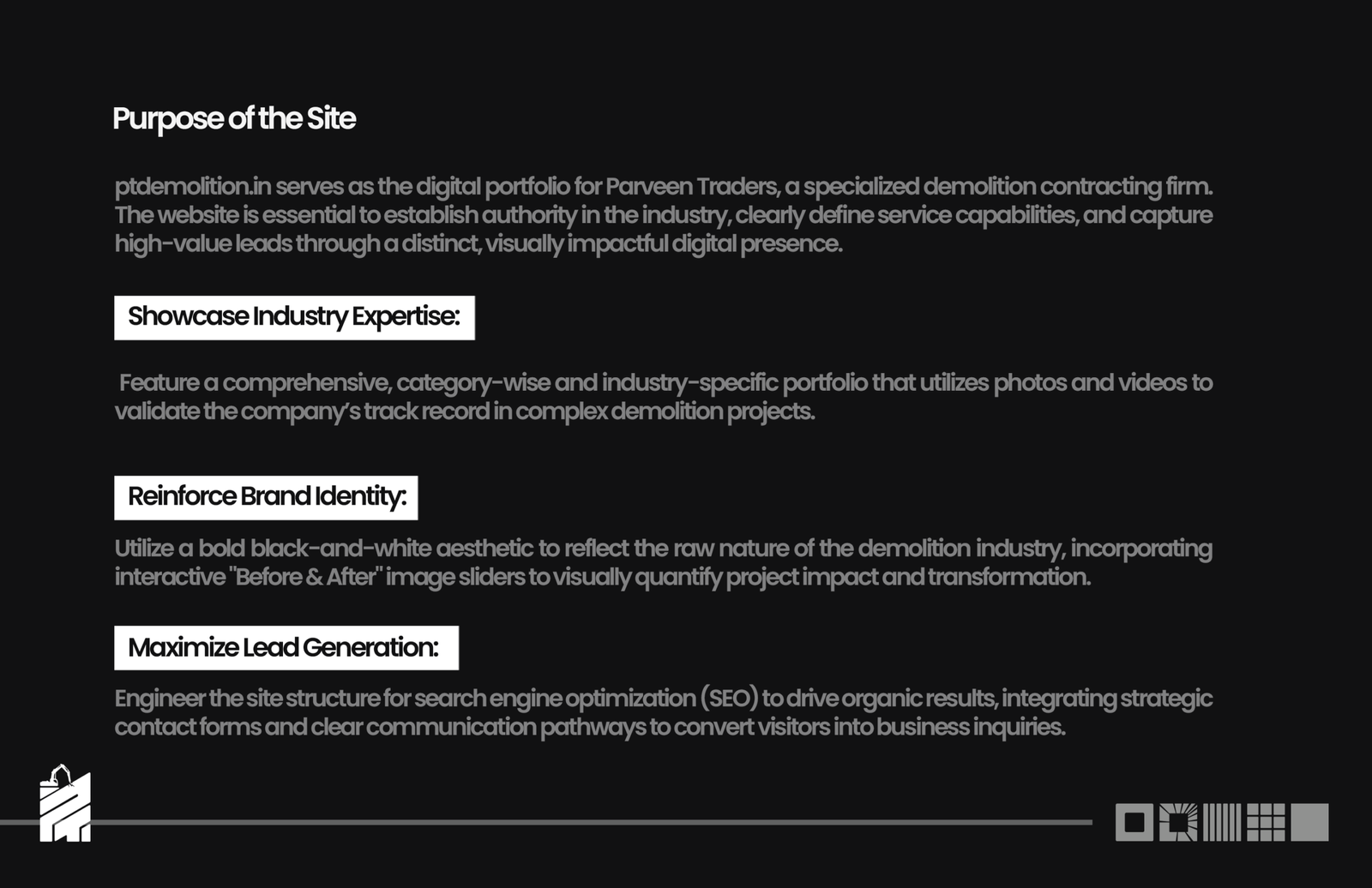 - We implemented a bold black-and-white design theme to visually resonate with the raw, industrial nature of the demolition sector. This striking aesthetic created a professional, distinctive look that sets the brand apart from competitors using generic templates.